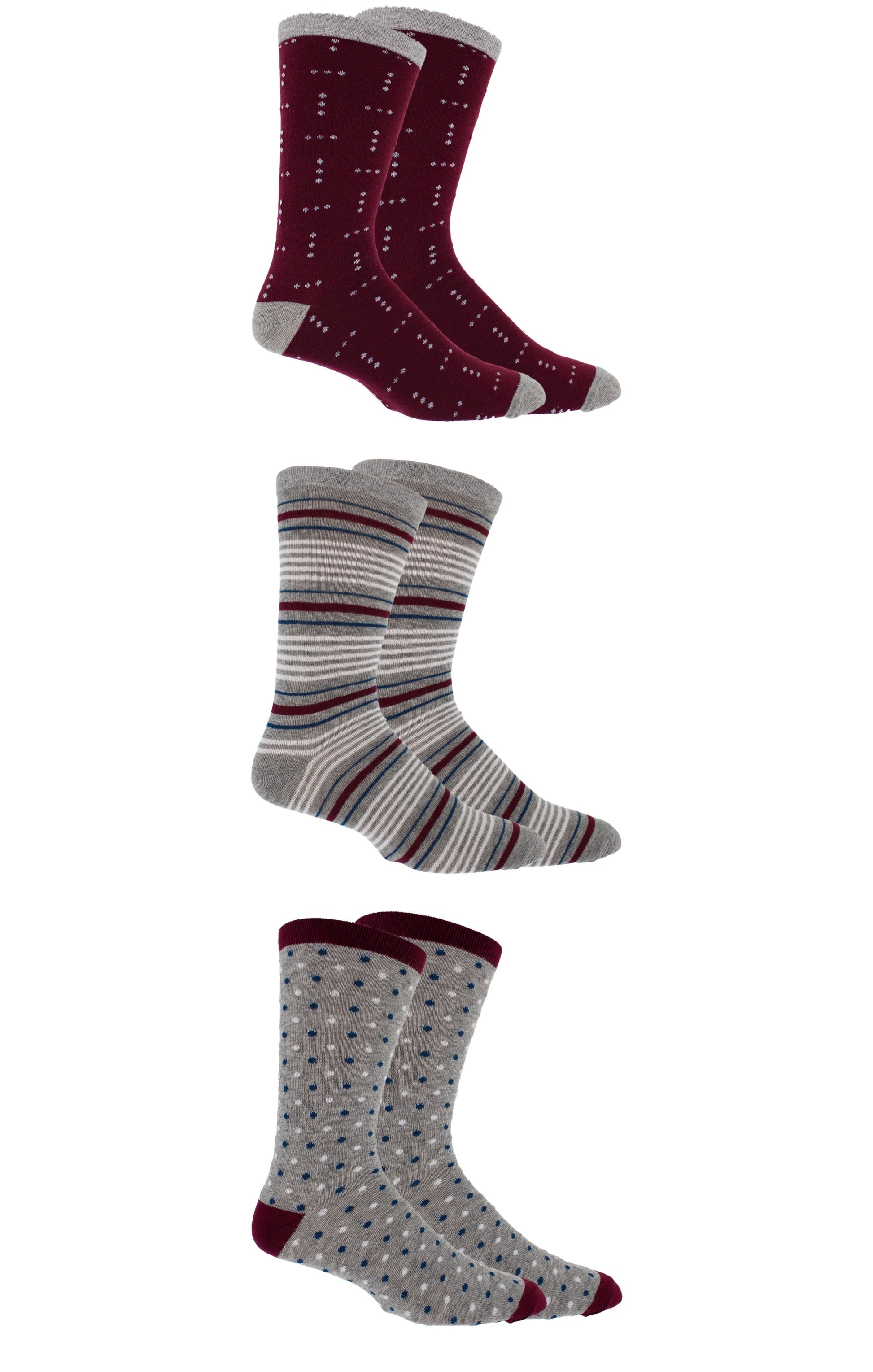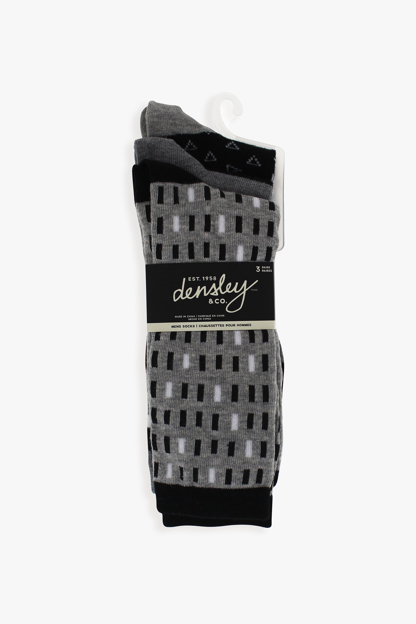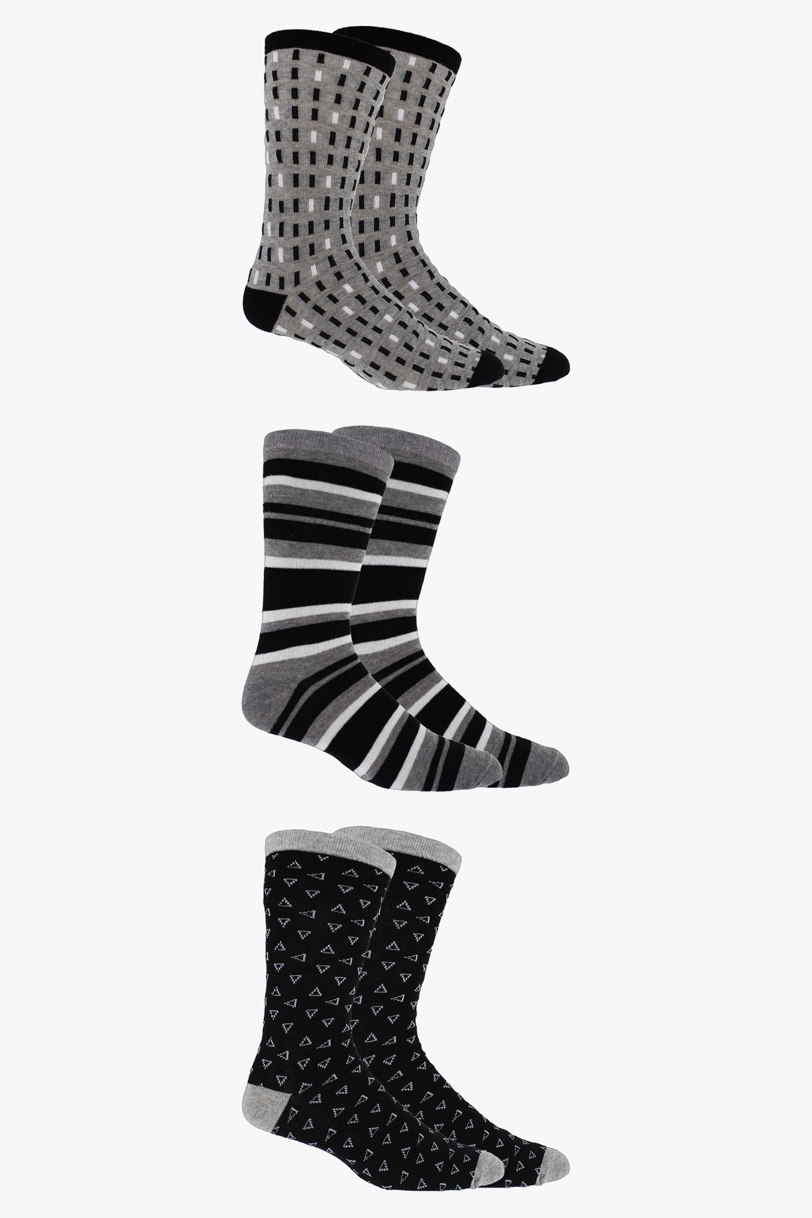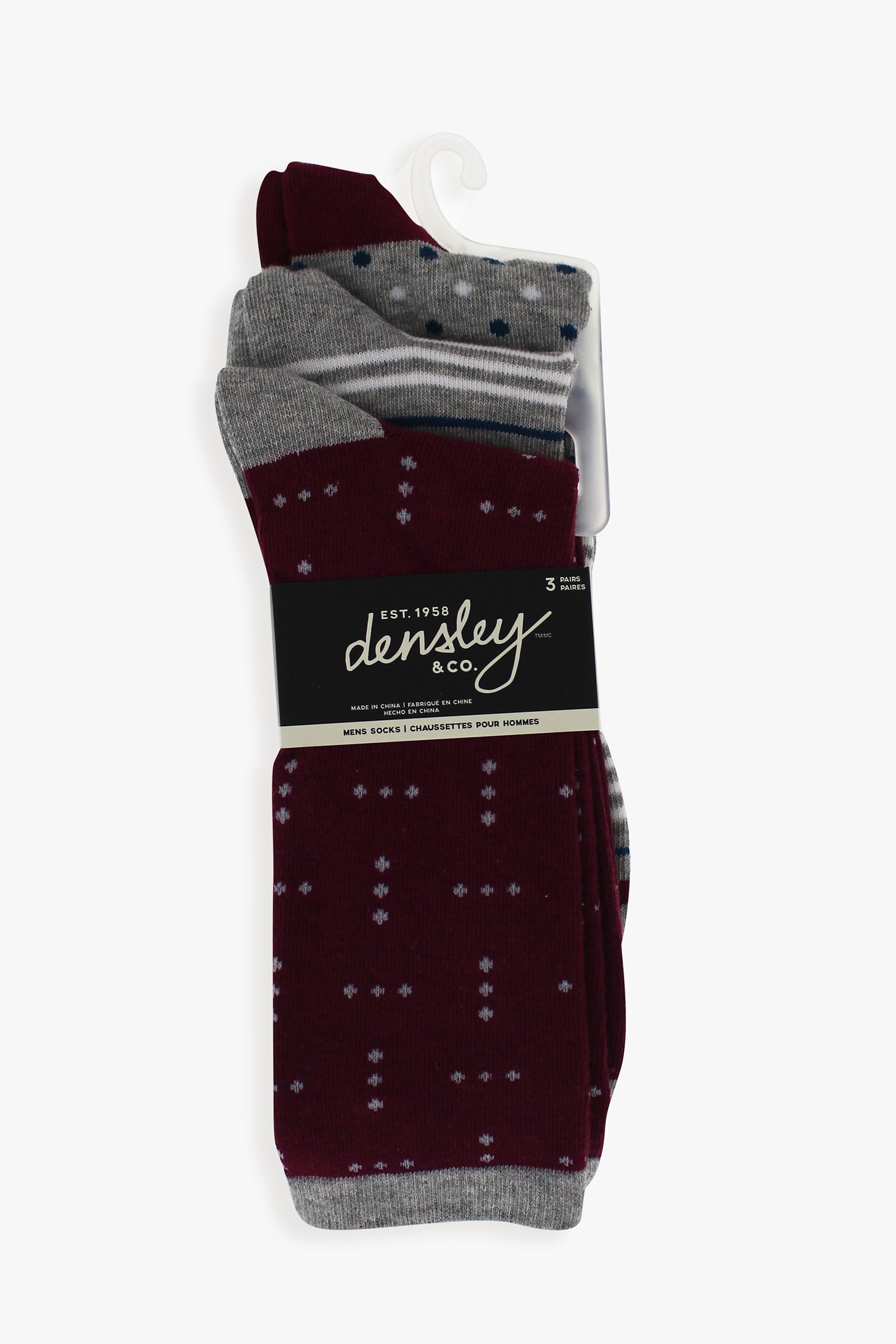 Unleash a stylish statement with the Densley&Co Men's 3-Pack of Graphic Pattern Cotton Dress Crew Socks, crafted with a luxurious blend of comfort and quality. Elevate your ensemble with a touch of novelty and fun delivered through a variety of assorted patterns and styles.