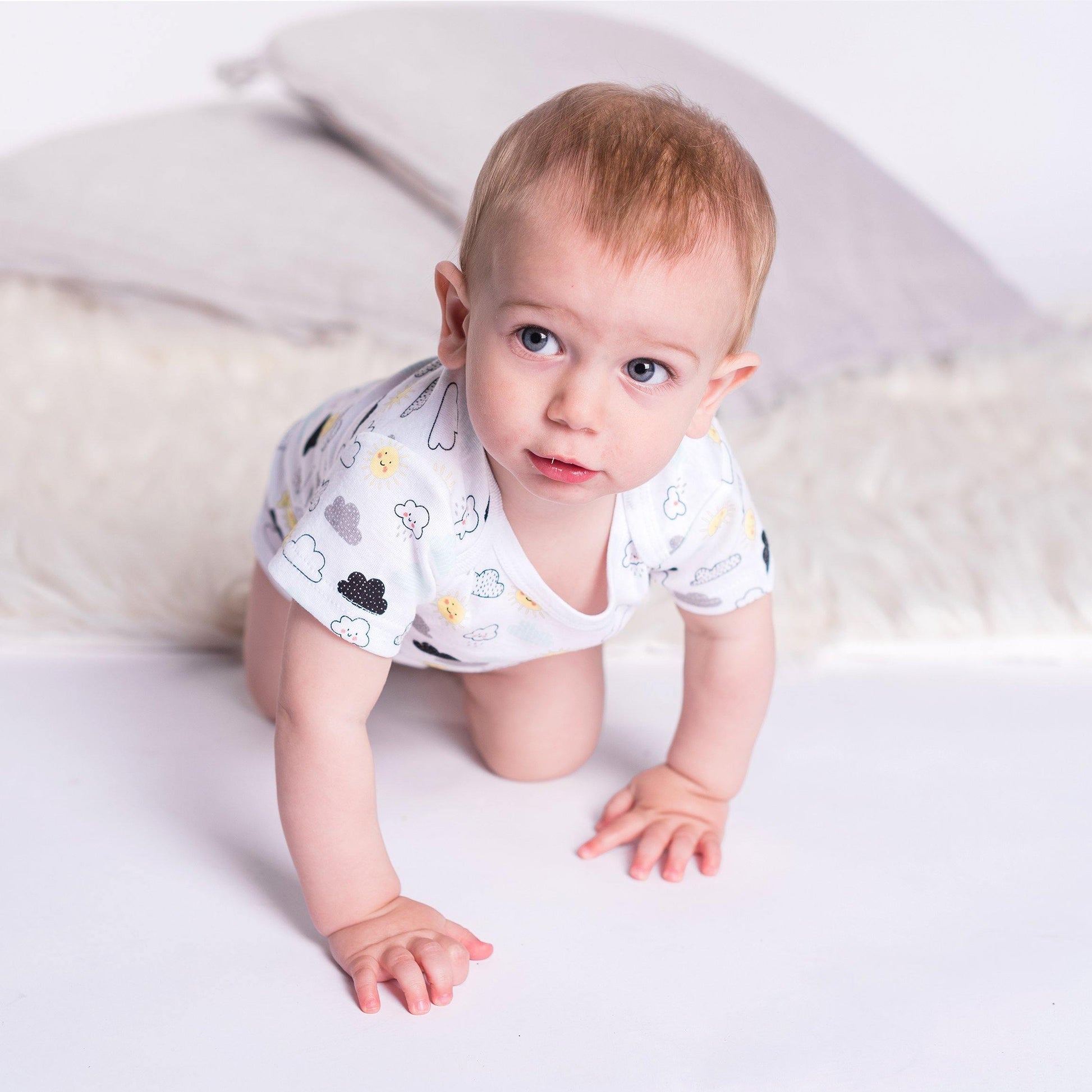 🤗Dress mini-me in our 3-pack of short sleeve bodysuits – clouds 🌥️, suns ☀️ & stripes 📏. 100% soft cotton will keep baby cozy. ⚡️Details: 100% Cotton Rib, 3 Pack, Rib-knit neckline, Snaps, Tagless label, Short sleeves. Care: Machine wash cold, mild detergent, Non-chlorine bleach, Tumble dry low, Iron inside out on low. 🧼