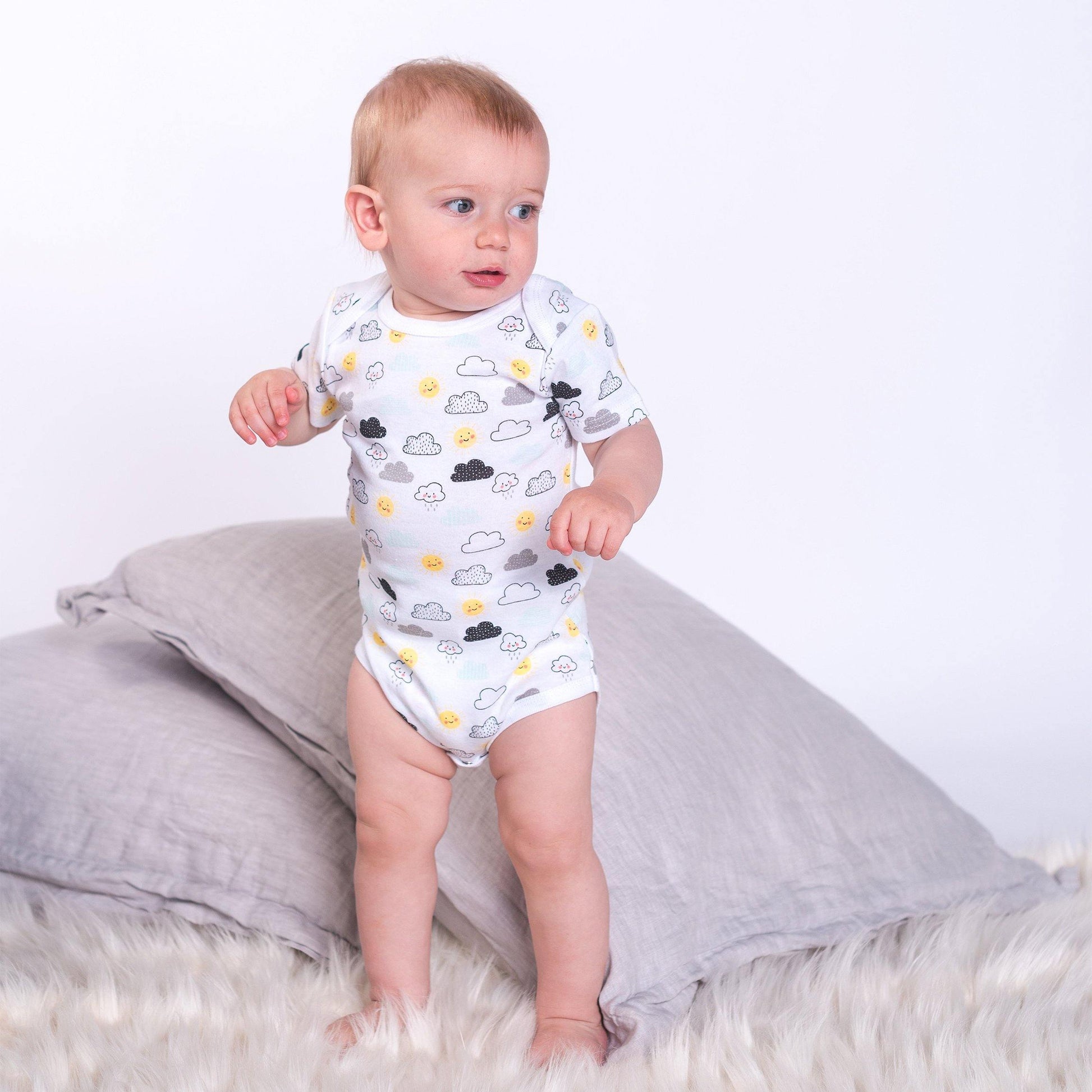 Bring out your little one's style with our cozy Black & White Collection! Our grey cloud printed short sleeve bodysuits feature snappy closure for easy dressing and changing. All made from soft organic cotton for a perfectly gentle touch. Get the baby essentials now and delight in their sweet simplicity! Product Details: 100% Organic Cotton Rib, Rib-knit envelope neckline, Snaps for easy dressing/changing, Tagless label inside neckline, Short sleeves.