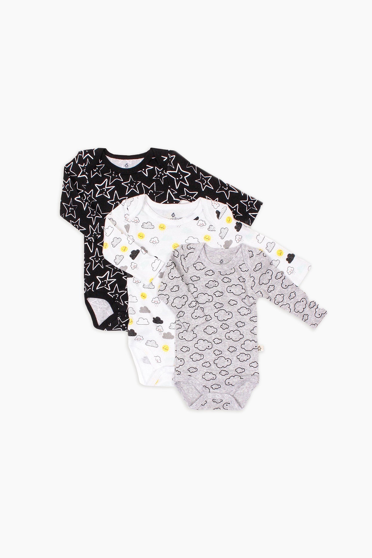 Color: Black & WhiteFeatures: This adorable pack comes in 3 patterns; black with stars, grey with clouds, and white with clouds. Pair these with one of matching pants for a starry look! Choose between a 3-pack of short sleeves or long sleeves. Rib-knit envelope neckline. Snaps for easy dressing and changing. Tagless label inside neckline.