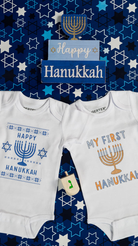 Welcome your little miracle to the holiday season with this adorable Hanukkah Baby Onesie! A perfect way to dress up your little one for the holiday, this snug fit onesie is sure to give your bundle of joy the street cred they deserve. Light up your family’s holiday celebrations with this festive lil onesie!