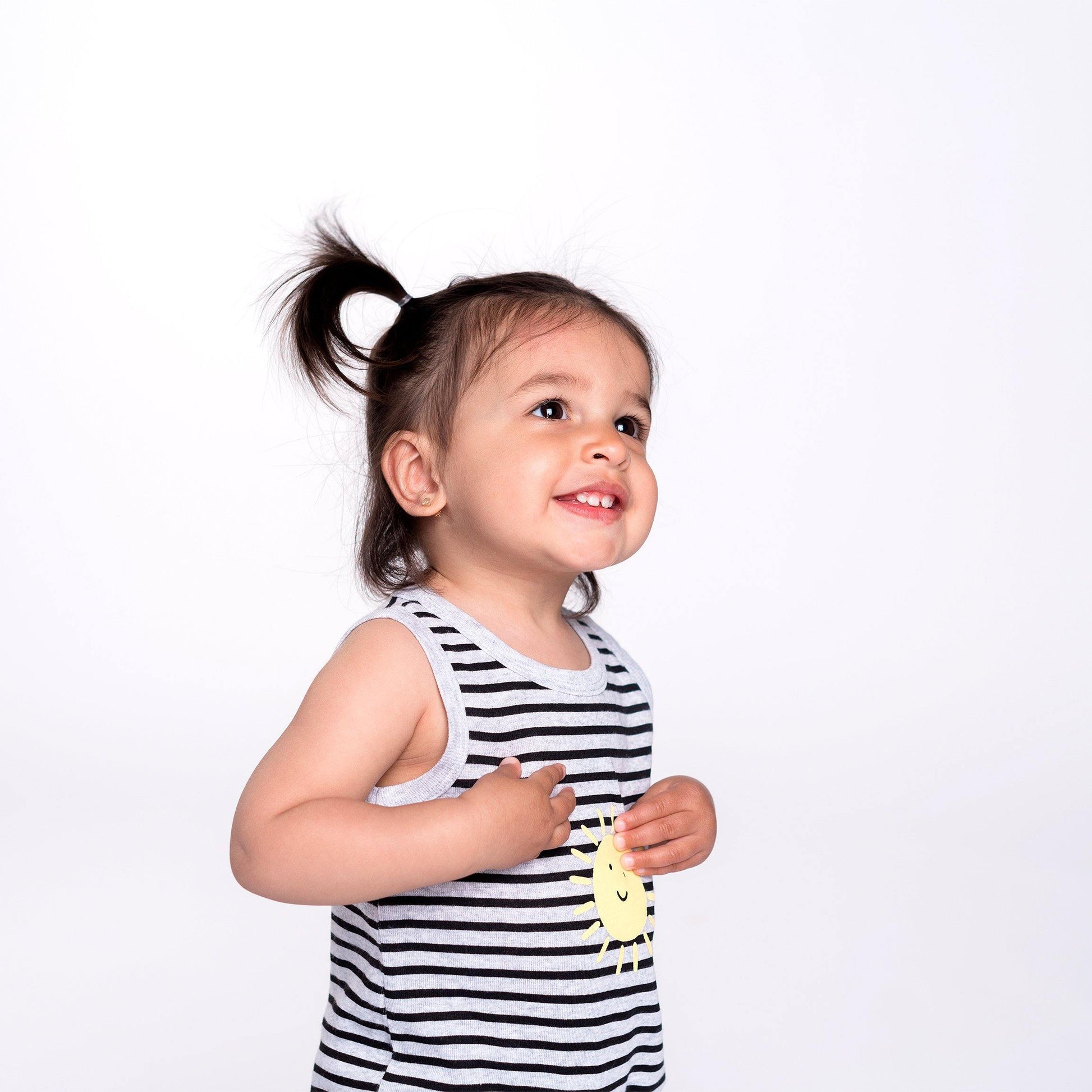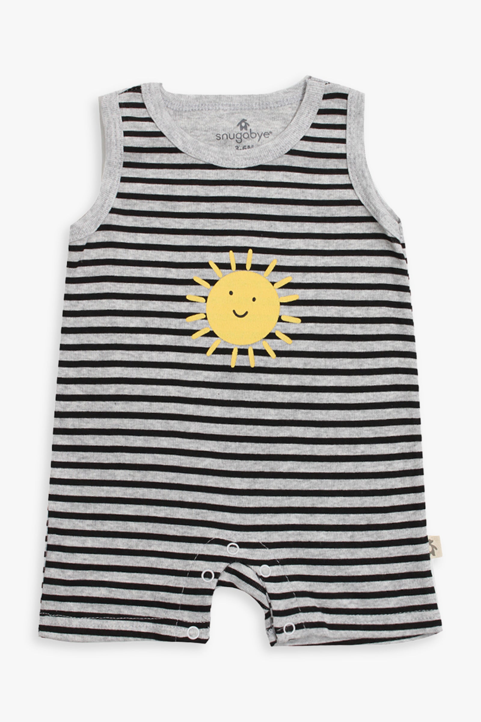 The Black & White Sun Sleeveless Romper is perfect for every parent. Crafted with 100% cotton, it's soft and stretchy to ensure your little one is comfy! The snap closure keeps diapers secure, and the simple & sweet black & white style provides a timeless look. Enjoy sunny days with this stylish romper! Fabric: 100% cotton, Soft & Supple. Design: Sleeveless, snap closure.