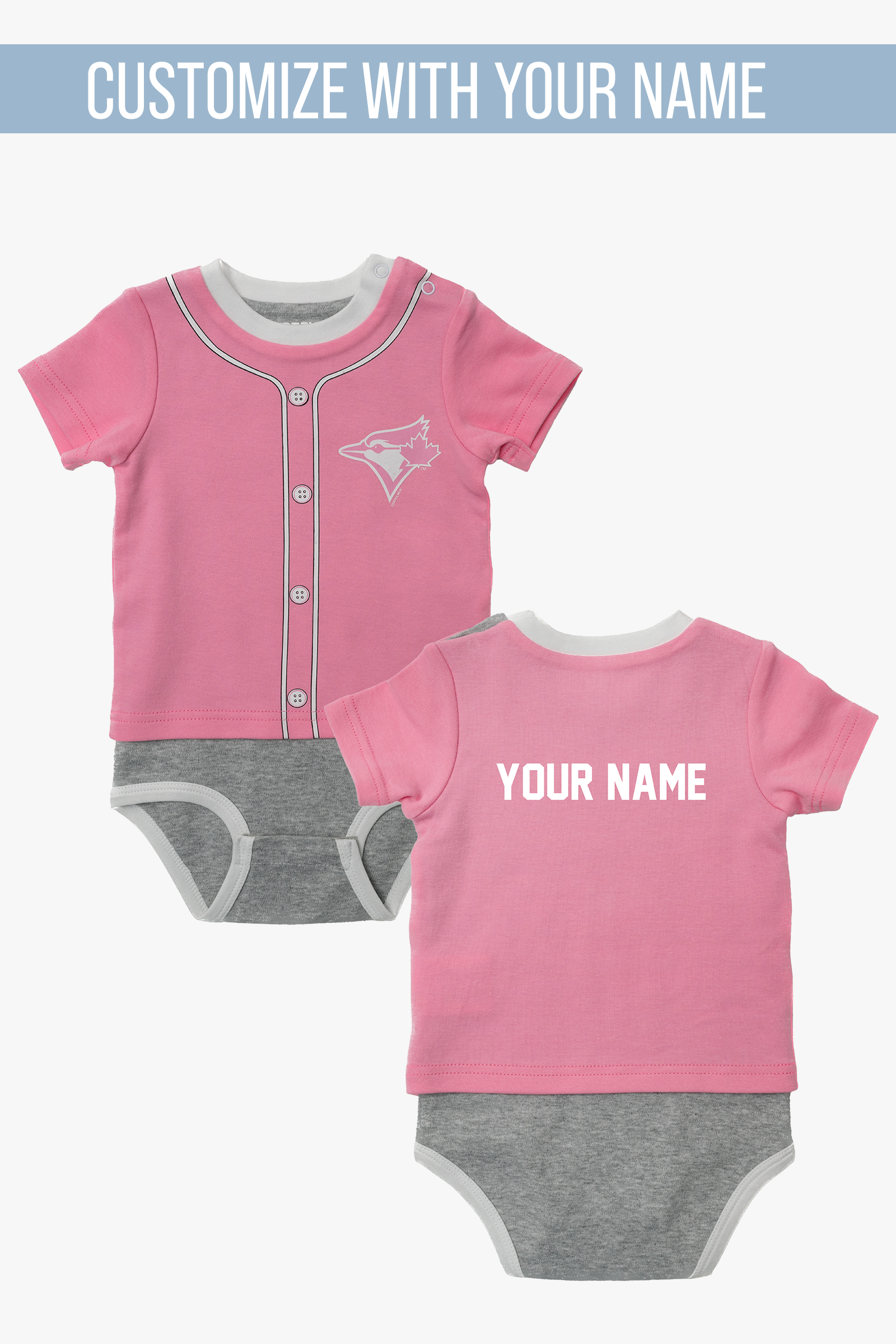 Shake Things Up with a Custom Toronto Blue Jays Baby Pink Fooler T-Shirt Bodysuit: Put your own spin on playtime by adding your little one's name to this cute onesie, creating a unique and memorable keepsake!