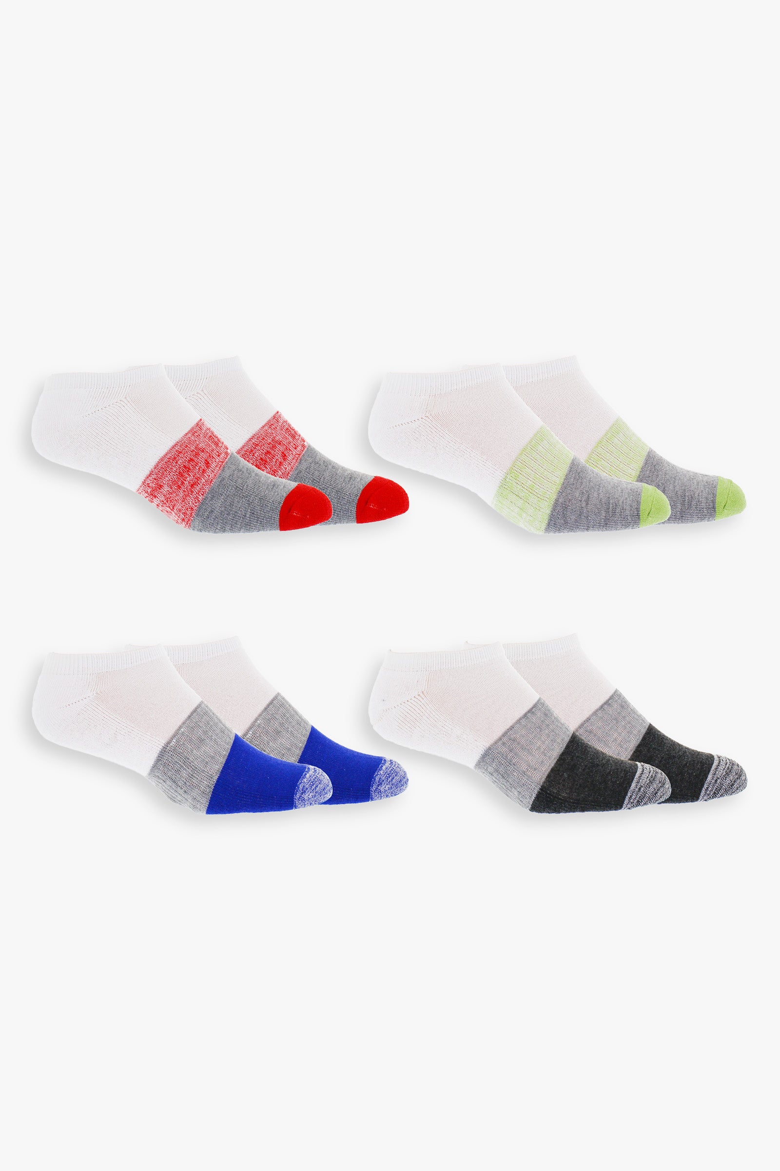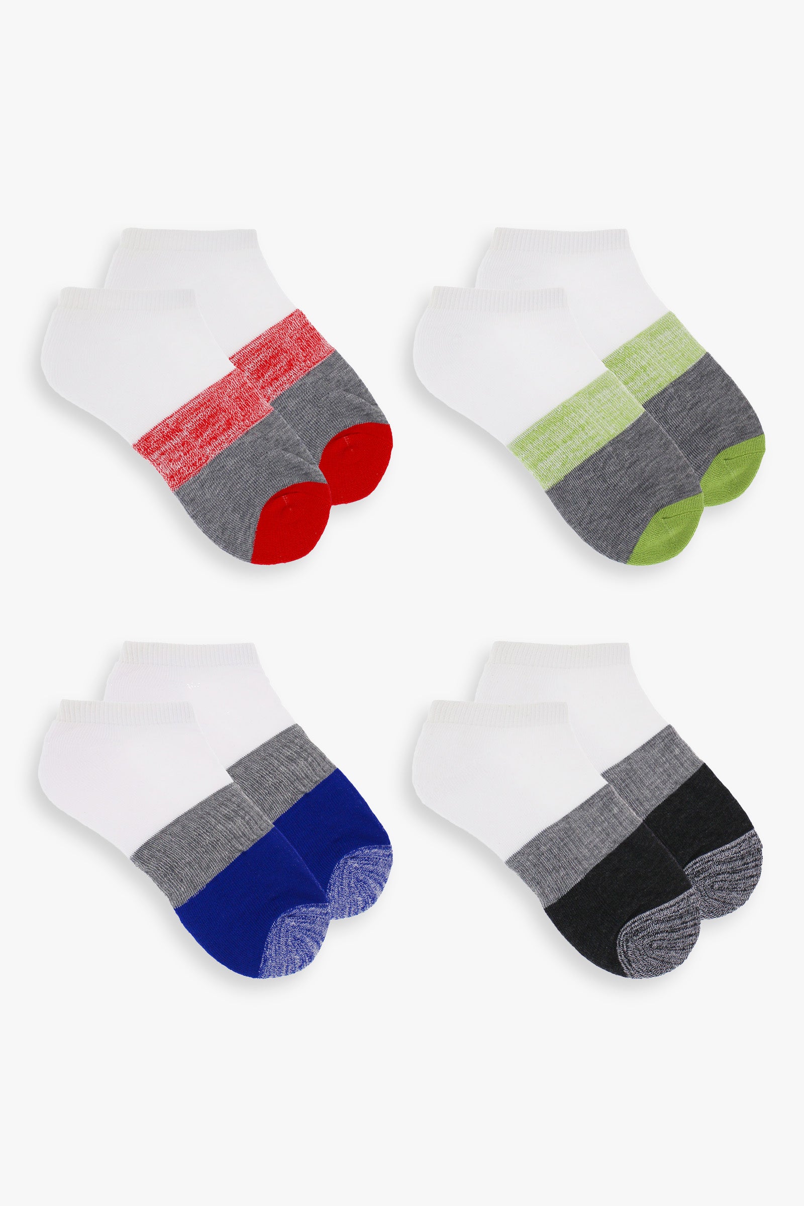 The Mens 4-Pak Athletic No Show Socks feature a ribbed cuff for arch support, a cushioned sole for extra comfort, and 98% polyester, 2% spandex construction for superior durability. Perfect for everyday wear and an ideal choice for athletes.